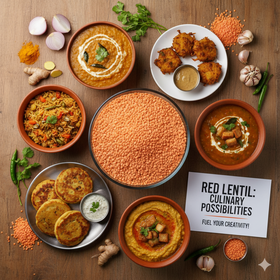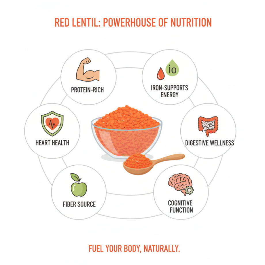 Red lentils are a nutrient-rich, quick-cooking legume ideal for wholesome everyday meals. Naturally loaded with plant-based protein, dietary fiber, and essential minerals like iron and folate, they help support energy levels and overall wellness. These split and hulled lentils cook quickly into a creamy texture, making them perfect for soups, dals, curries, and stews. With their mild, slightly sweet flavor, red lentils are both nourishing and versatile—an excellent choice for balanced, healthy living.